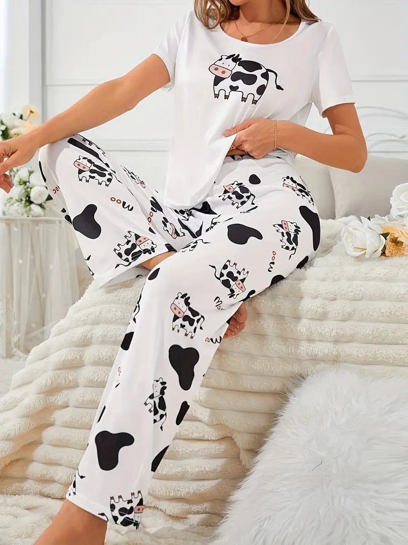 Each set features a short-sleeve, round-neck T-shirt paired with coordinating full-length pants. The fit is relaxed yet flattering, ideal for lounging at home, stepping out for errands, or enjoying a cozy evening indoors. Crafted from a breathable, skin-friendly fabric blend, these pieces feel incredibly soft against the skin while offering lightweight ease that works in all seasons.
